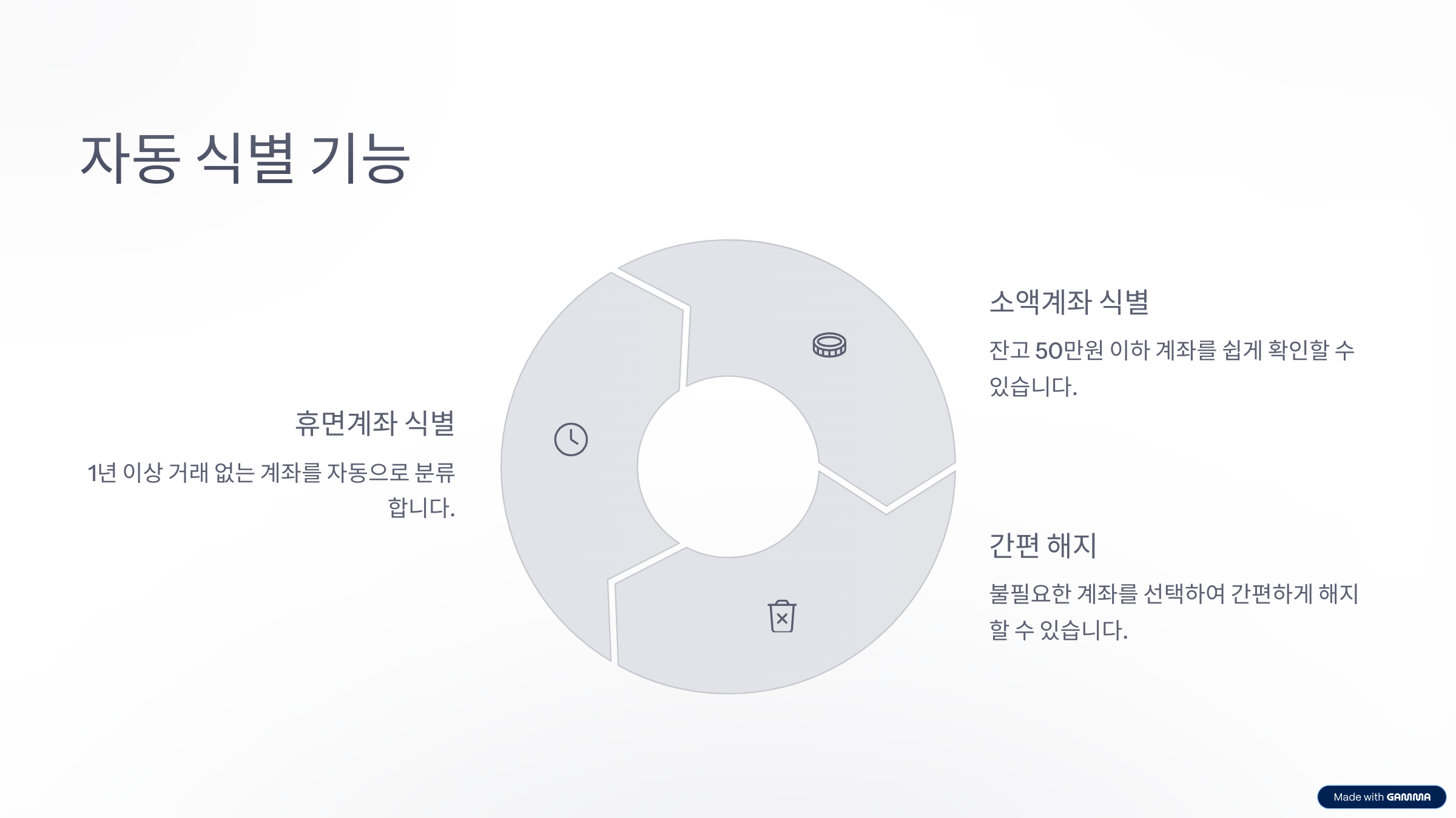 이 서비스는 개인 명의의 모든 금융계좌를 한눈에 조회하고, 휴면 계좌를 해지하거나 잔고를 이전할 수 있도록 도와줍니다.