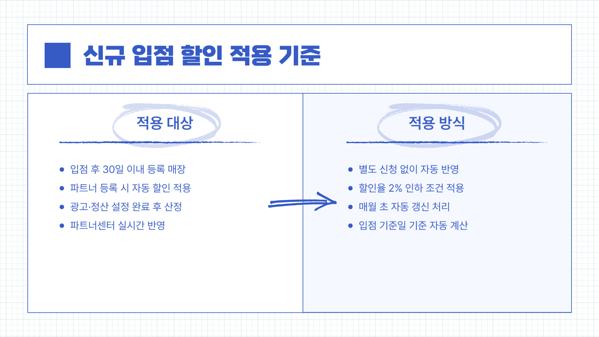 특히 신규 입점 할인은 광고, 정산 설정까지 완료된 날짜를 기준으로 계산됩니다.