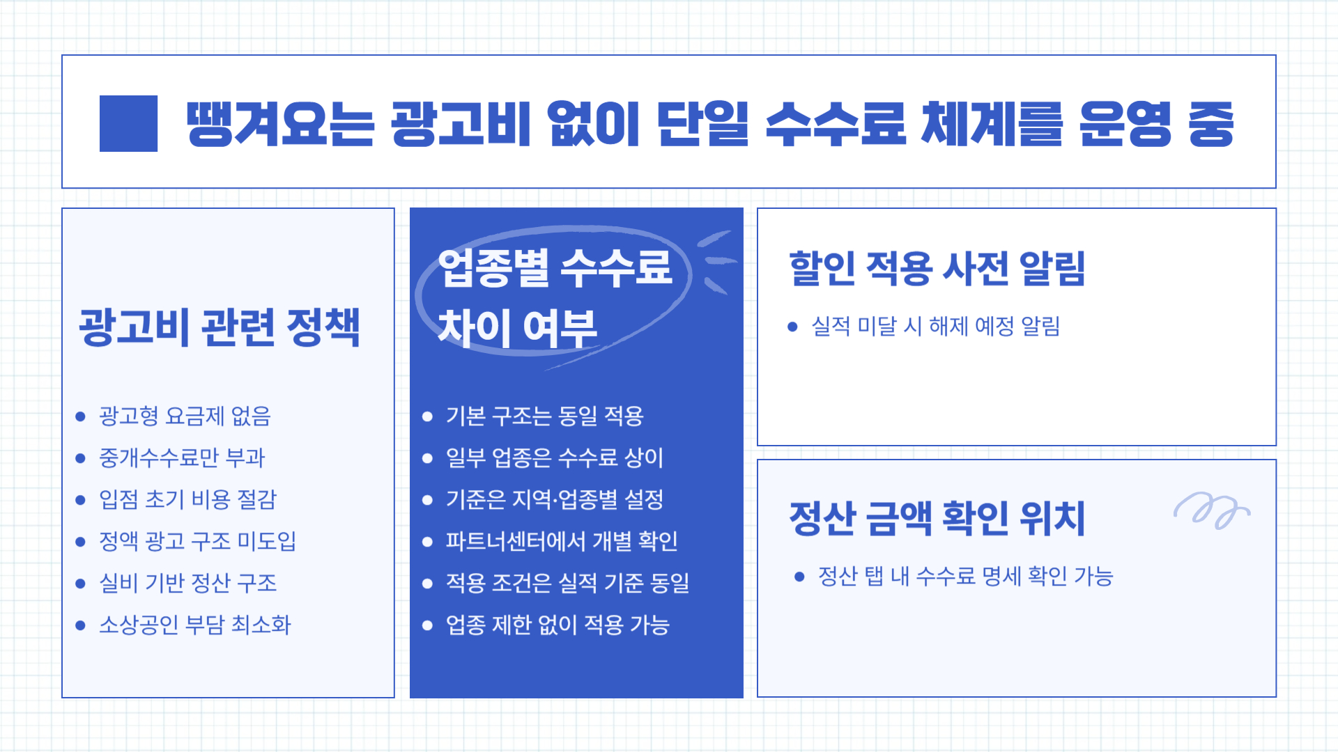 광고비가 별도로 부과되지 않는 구조이며, 수수료에 모든 비용이 포함됩니다.