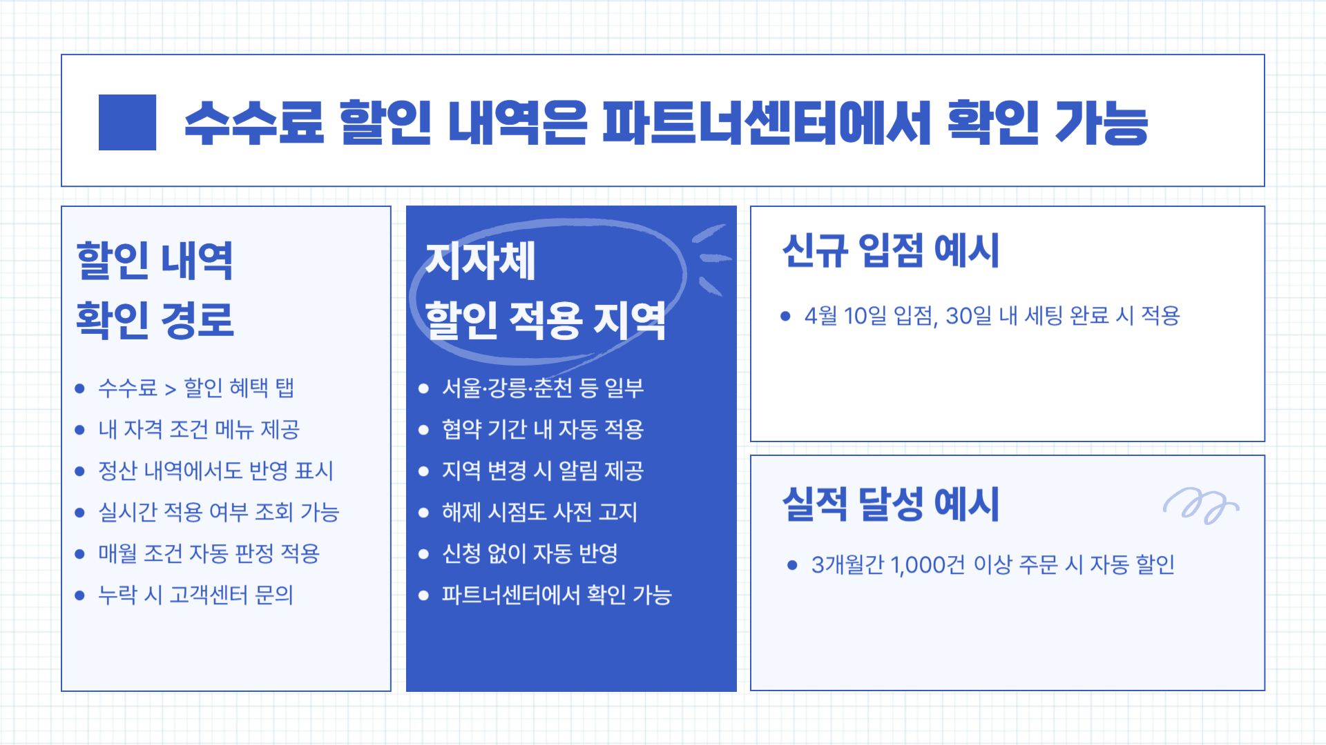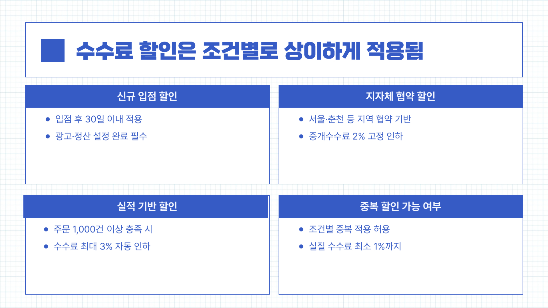 신규 입점, 주문 실적, 지역 협약 여부에 따라 중개수수료가 최대 5%까지 인하됩니다.