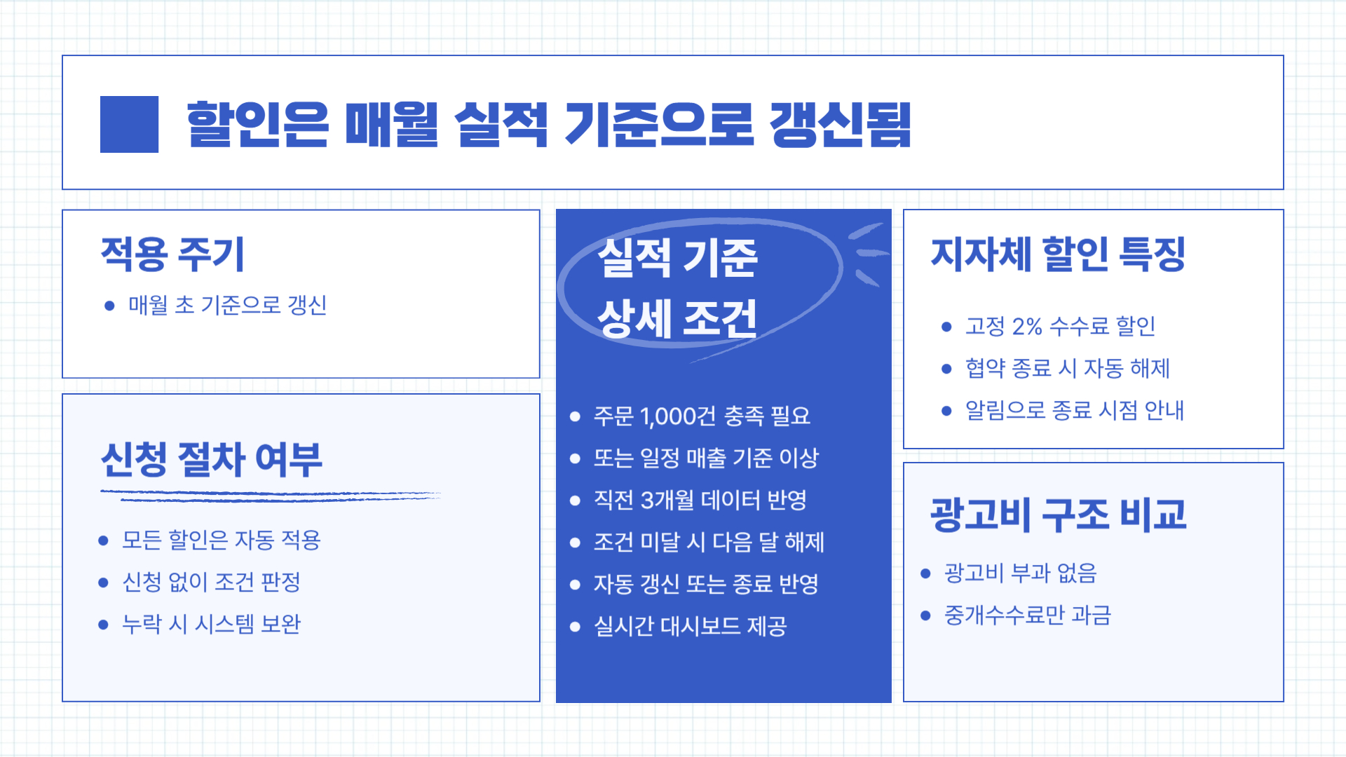 A. 가능합니다. 신규 입점 또는 주문 실적 조건만으로도 자동 할인 적용이 가능합니다.