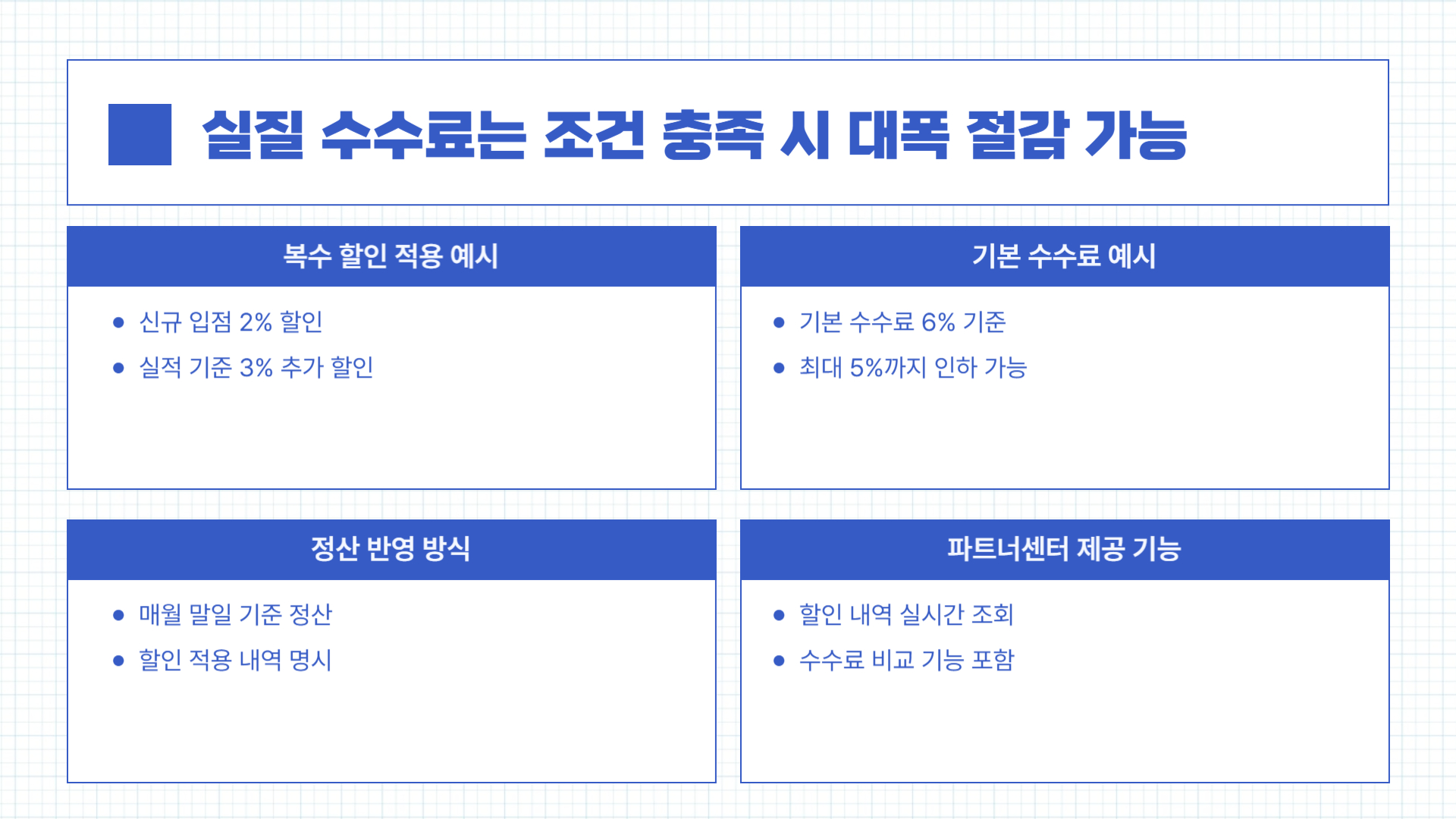 조건에 따라 중복 적용도 가능하며, 실질 부담 수수료는 1~3%까지 낮아질 수 있습니다.
