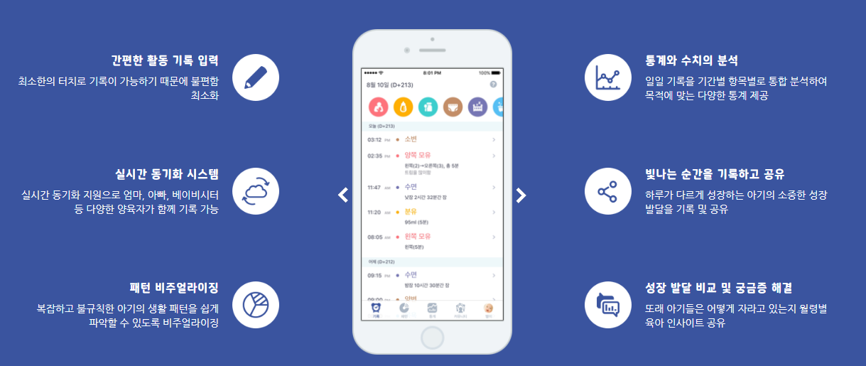 이 앱을 통해 부모는 아기의 수유, 수면, 기저귀 교환 등의 일상 활동을 기록하고, 아기의 성장 과정을 추적할 수 있습니다.