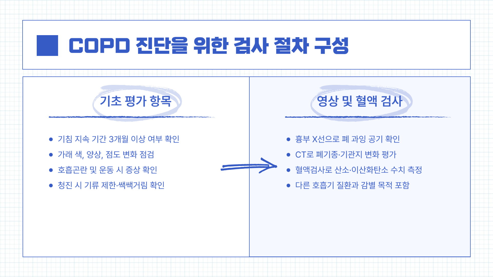 기초 문진과 청진 검사는 COPD 여부를 가늠하는 출발점입니다.