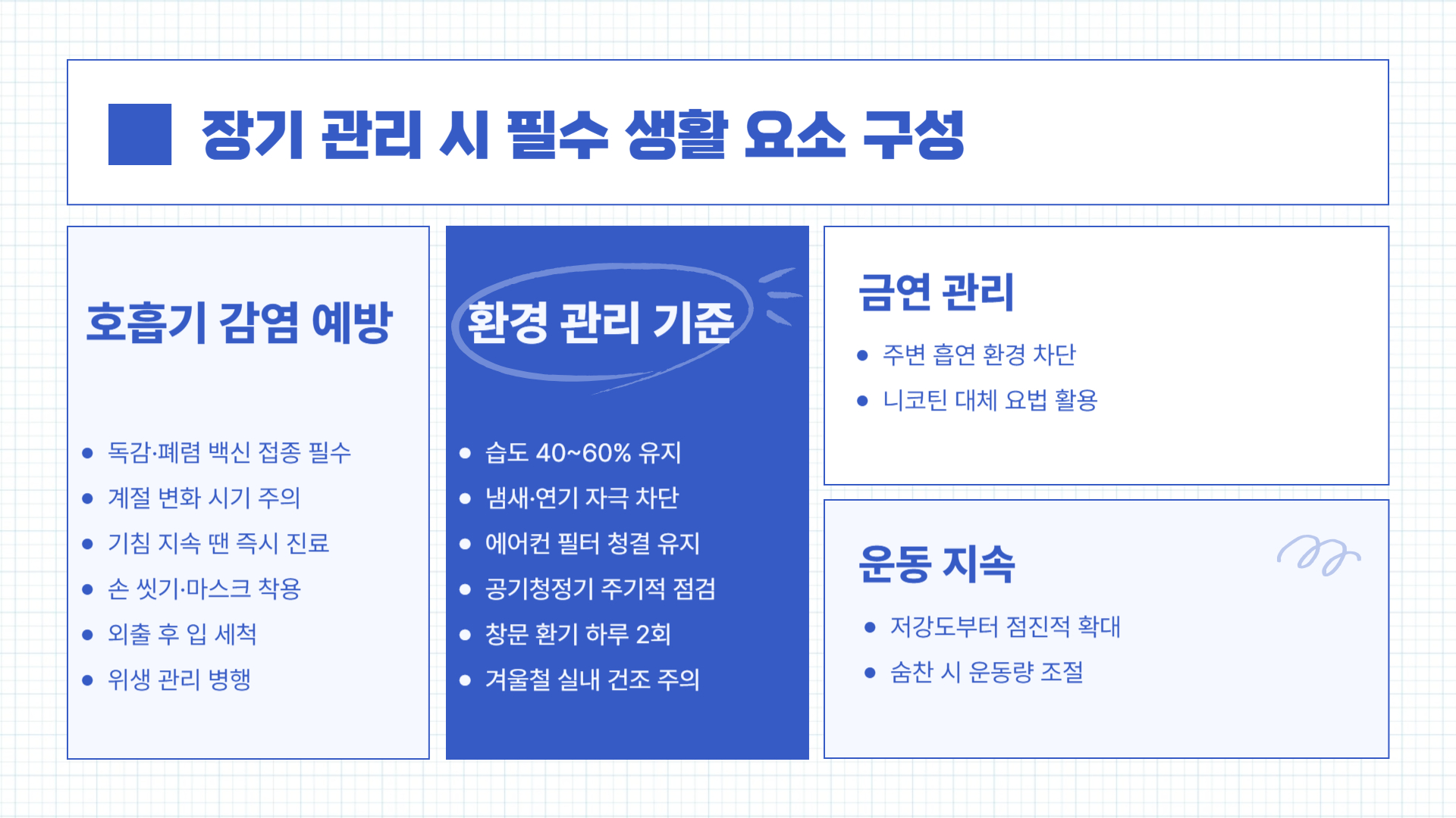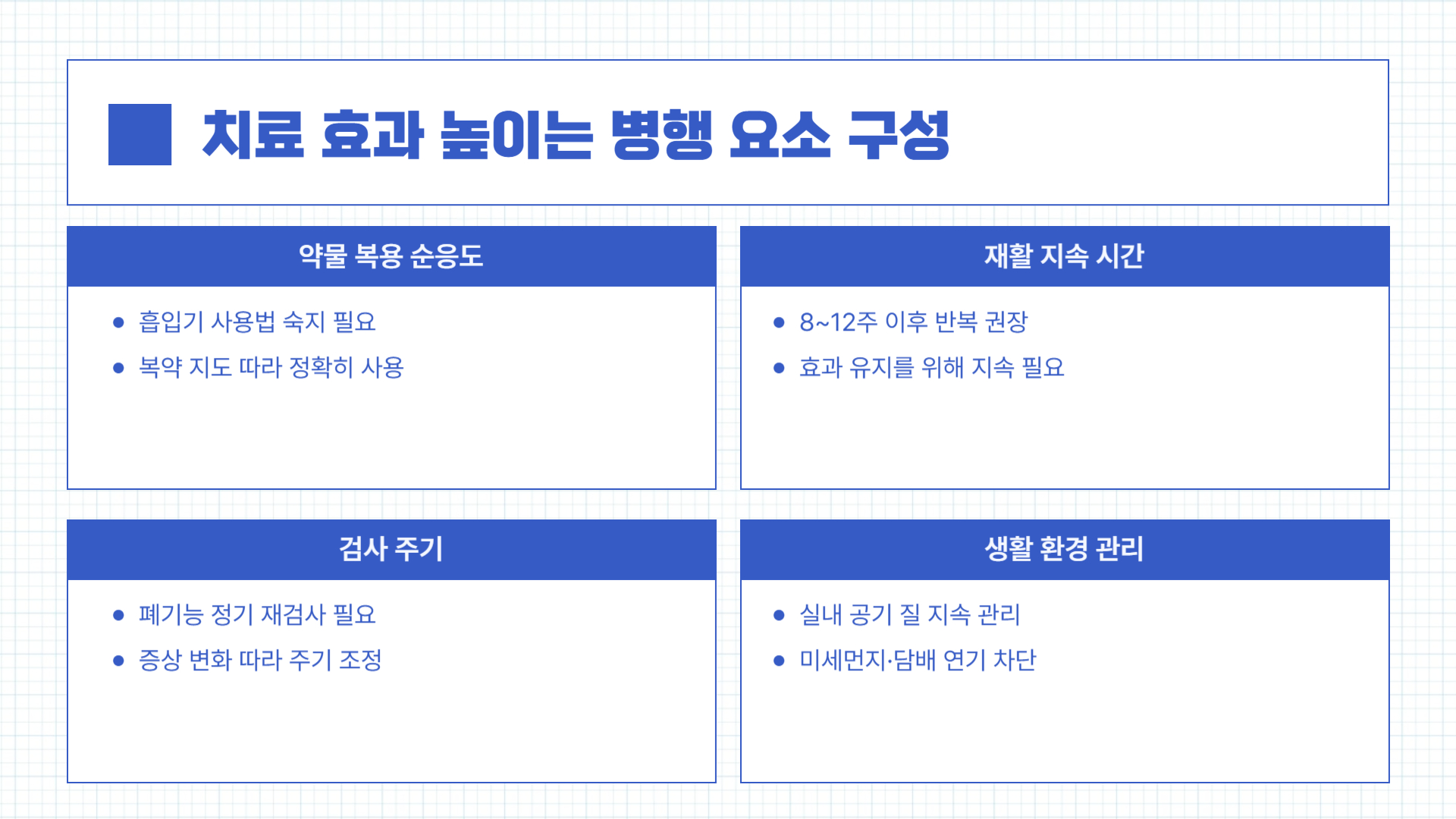 약물 외에도, 호흡 재활과 운동 요법이 관리에 큰 영향을 미칩니다.