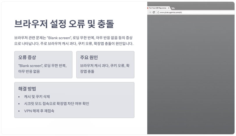 - 원인: 브라우저 캐시 과다, 쿠키 오류, 확장앱 충돌